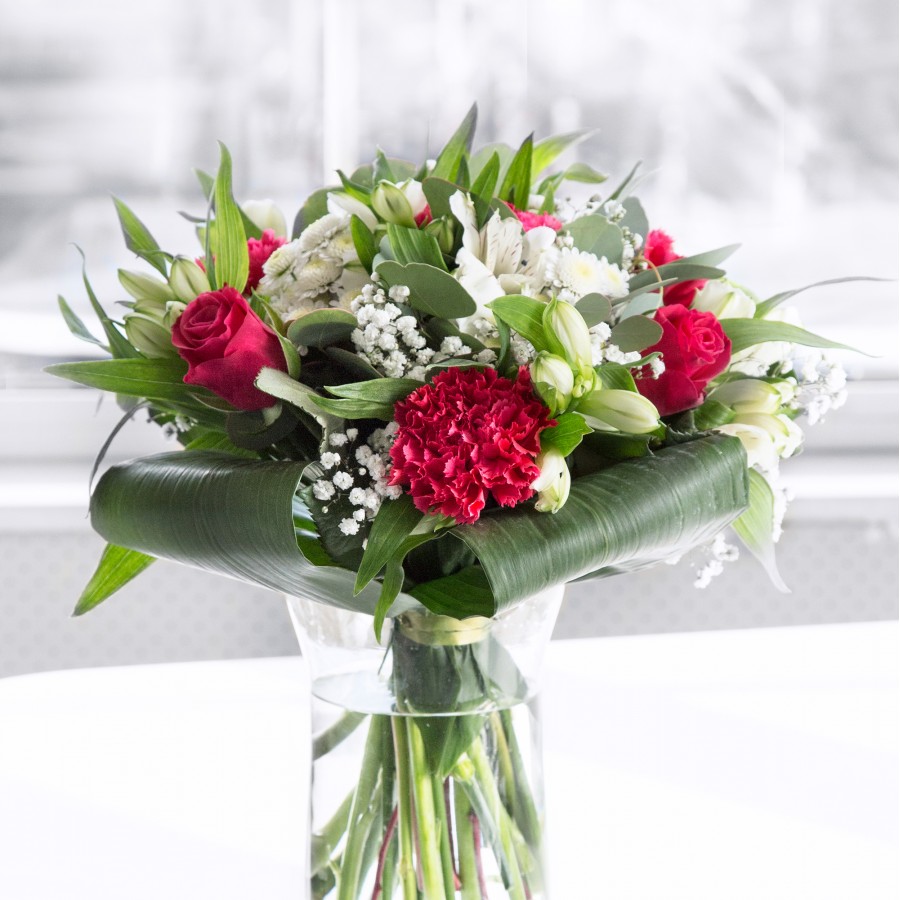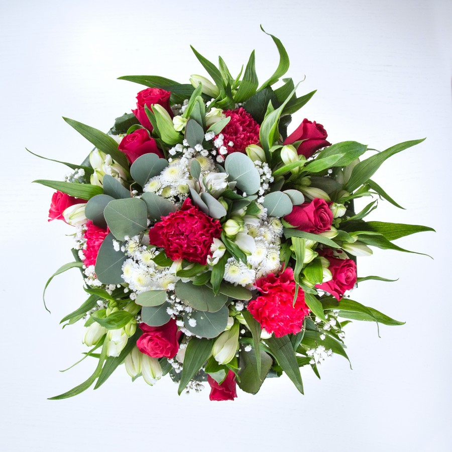 Experience the captivating beauty of our Luxurious Harmony Floral Arrangement. This unique bouquet features pure white chrysanthemums, airy gypsophila, rich red roses, charming carnations, elegant white alstroemeria, and vibrant aspidistra leaves, all hand-selected for their exceptional freshness.